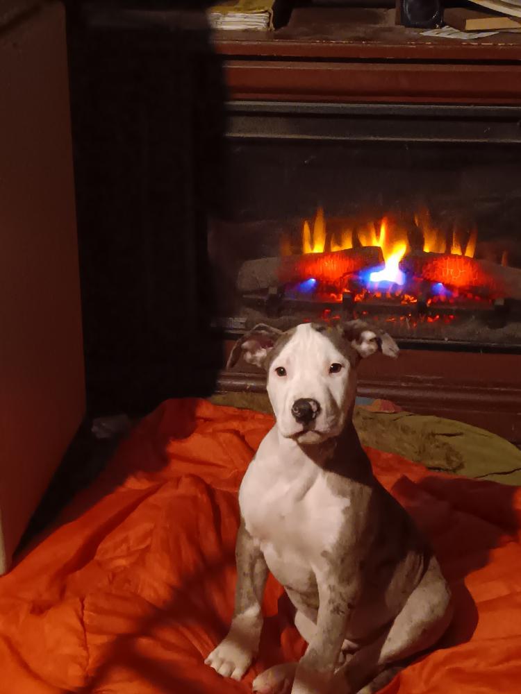 Pet Description:He’s 8 months old and has a brown leather collar |
