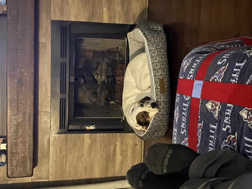Pet Description:Large dog white with brown patches on head, his collar came off but he should still have his flea and tick collar still on. |