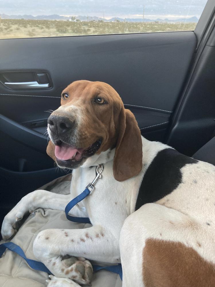 Pet Description:Female-1 yr old. White coat with brown face and ears. 1 large spot on either side of torso. Left sided spot looks like a heart. Small black and brown spots throughout coat. Yellowish collar that says “top paw” but no name tags. Not chipped. |