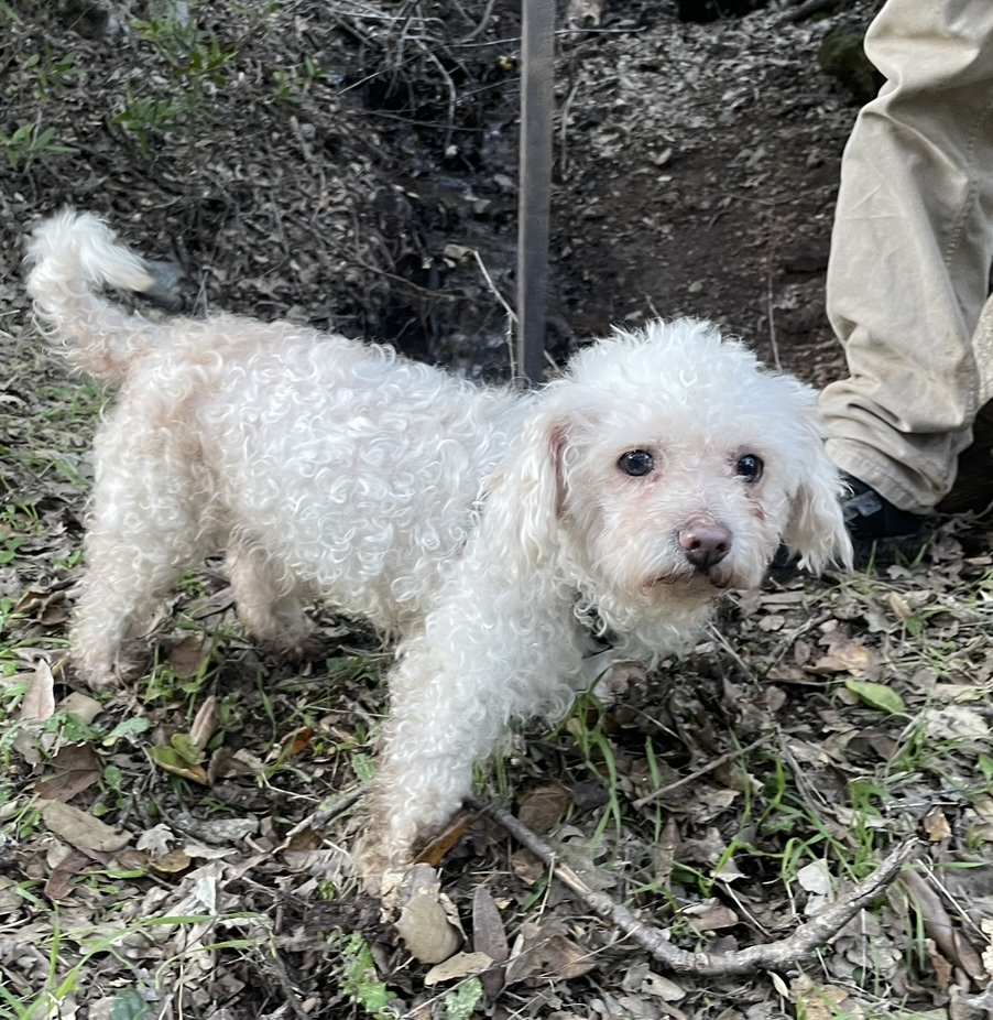Pet Description:wearing brown sweater. small white curly hair dog. listens to “Munchies” |