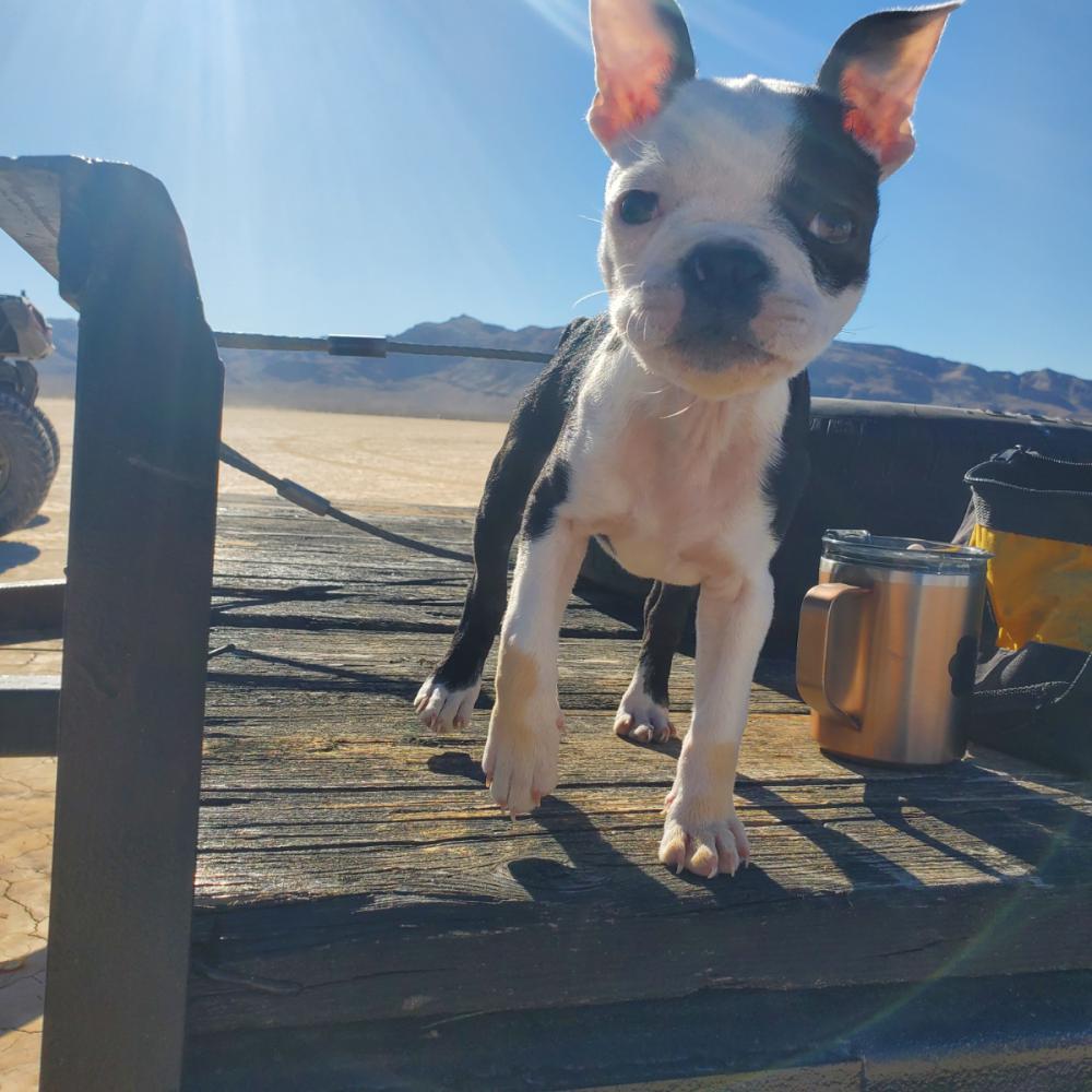 Pet Description:4 months old. No collar. No chip. White and black face with small black patch on front right leg |