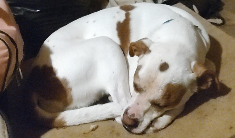 Pet Description:Pitbull boxer mix white and brown spots with tiny one on top of head spayed and very friendly. |