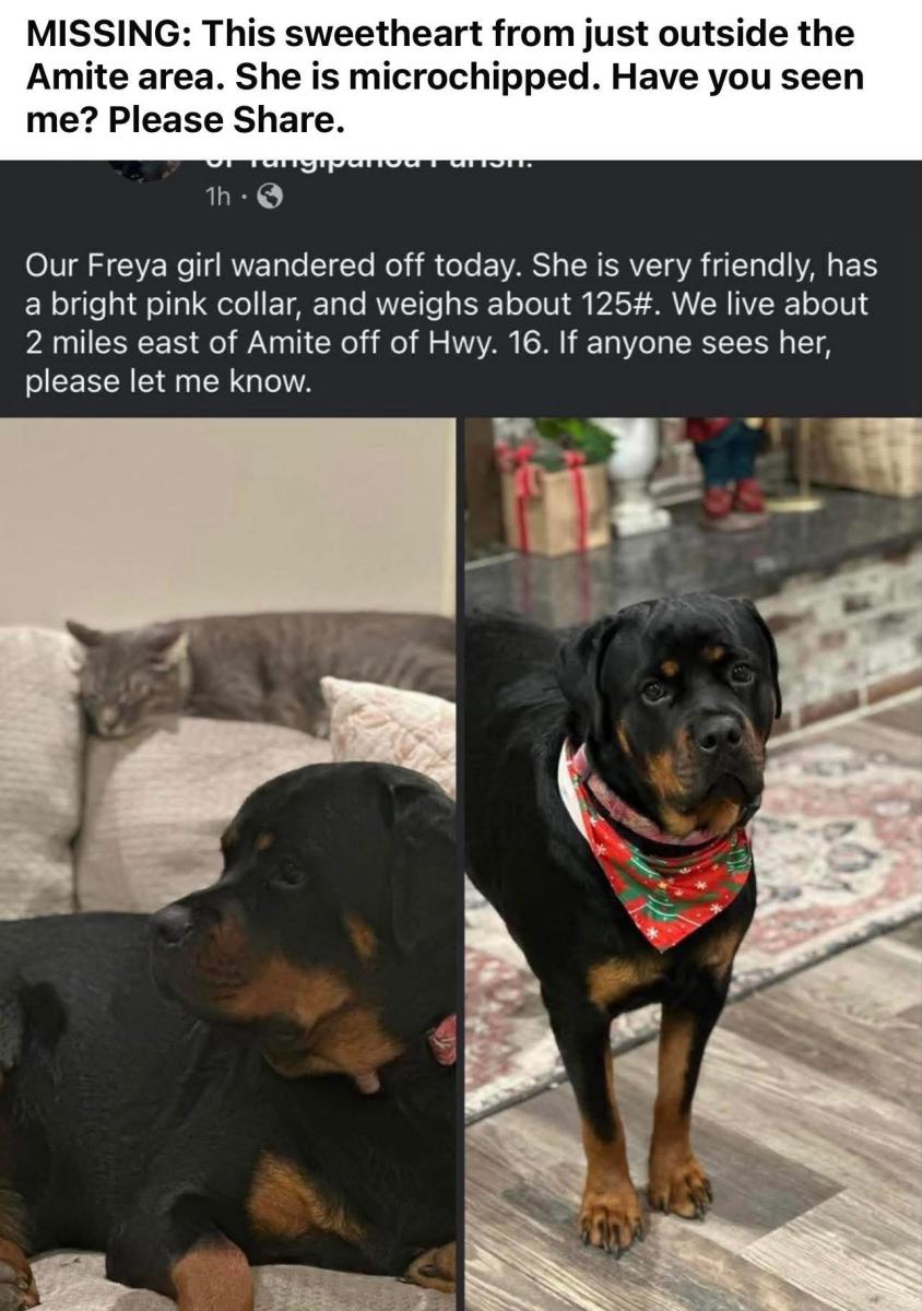 Pet Description:Black and brown and weighs 125 lbs |