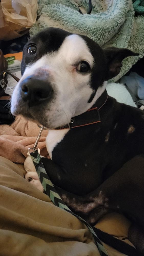 Pet Description:Pit mix or pocket pit. Very friendly, black and white, has some very thin spots of fur due to a skin condition. |