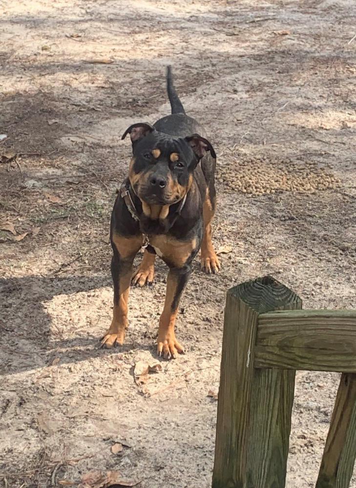 Pet Description:Black with brown on face and chest and legs he is a tri- bully most people mistaken him for a Rottweiler |