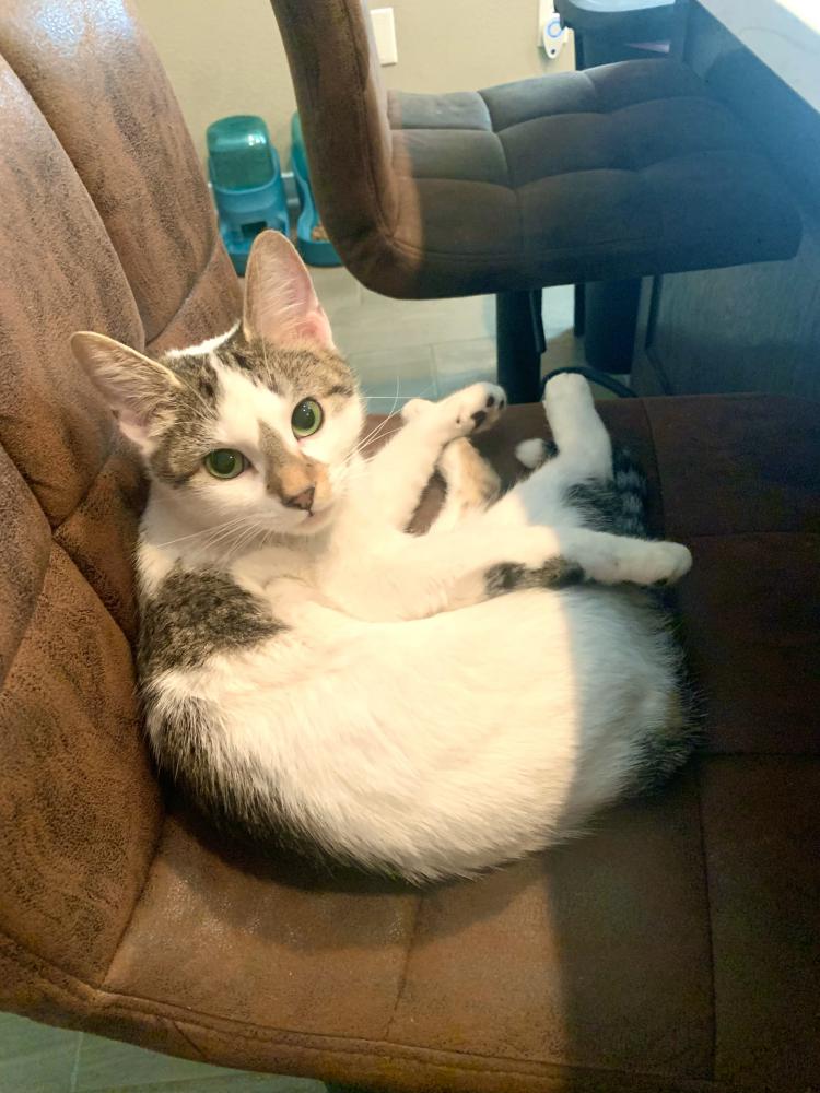 Pet Description:Clara is a mostly white cat with a few spots and a black & gray striped tail. She is 10lbs and has a coral reddish collar on. There is a tag with her name and our phone number, as well as a small bell. |