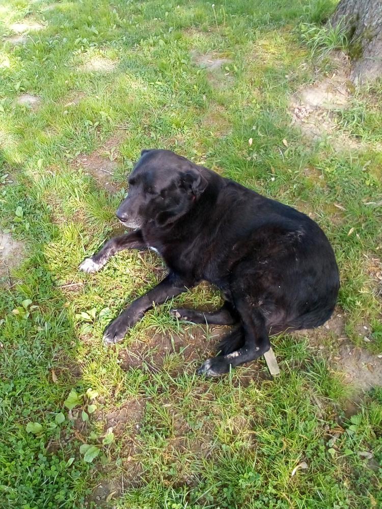Pet Description:Large black lab/newfoundland mix, white chest and white on his big feet. He has some areas of black on his tongue. He has gray around his muzzle and some slight cloudiness in his eyes. He is neutered. Was wearing a light green and black collar and with a bronze and white female Beagle. |