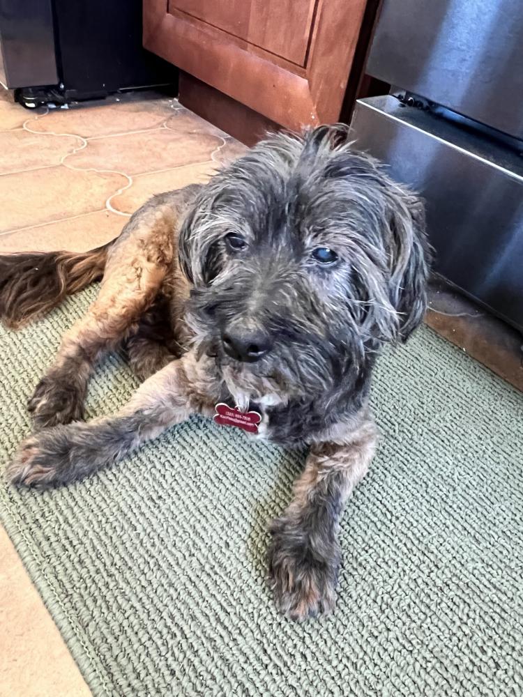 Pet Description:She’s an old dog dark brown light brown with white on her stomach. She limps a bit when she walks. |