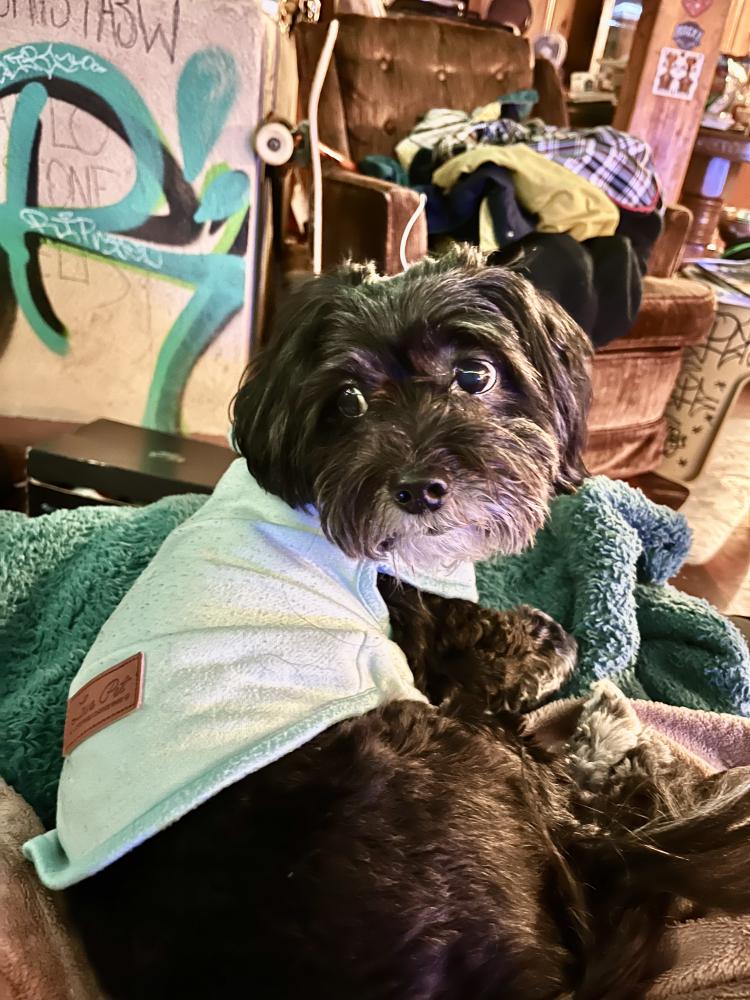 Pet Description:She very shy dog and is scared easy she can bite if startled but approached correctly she is very nice and sweet she’s black all over and white on her belly she’s 10 years old last seen wear a purple shirt |
