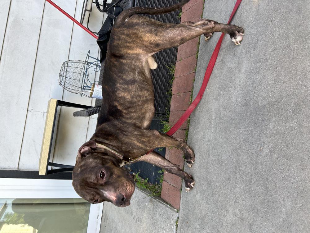 Pet Description:Super skinny, intact male, brindle, bully breed mix |