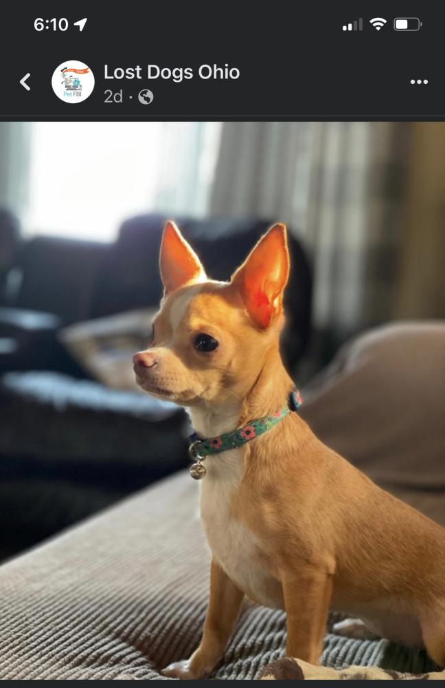 Pet Description:Tan and white 5 lb chihuahua wearing teal collar with pink flowers . Green tattoo on her belly from spay . |