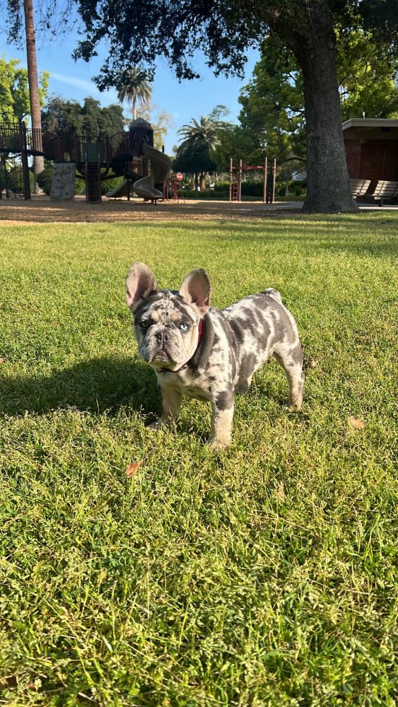 Pet Description:She is a puppy she has two different eye and she is a Merle she white cover in black spot . |