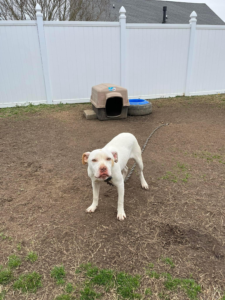 Pet Description:White male pitbull, has a red nose with a brown spot near his head. |