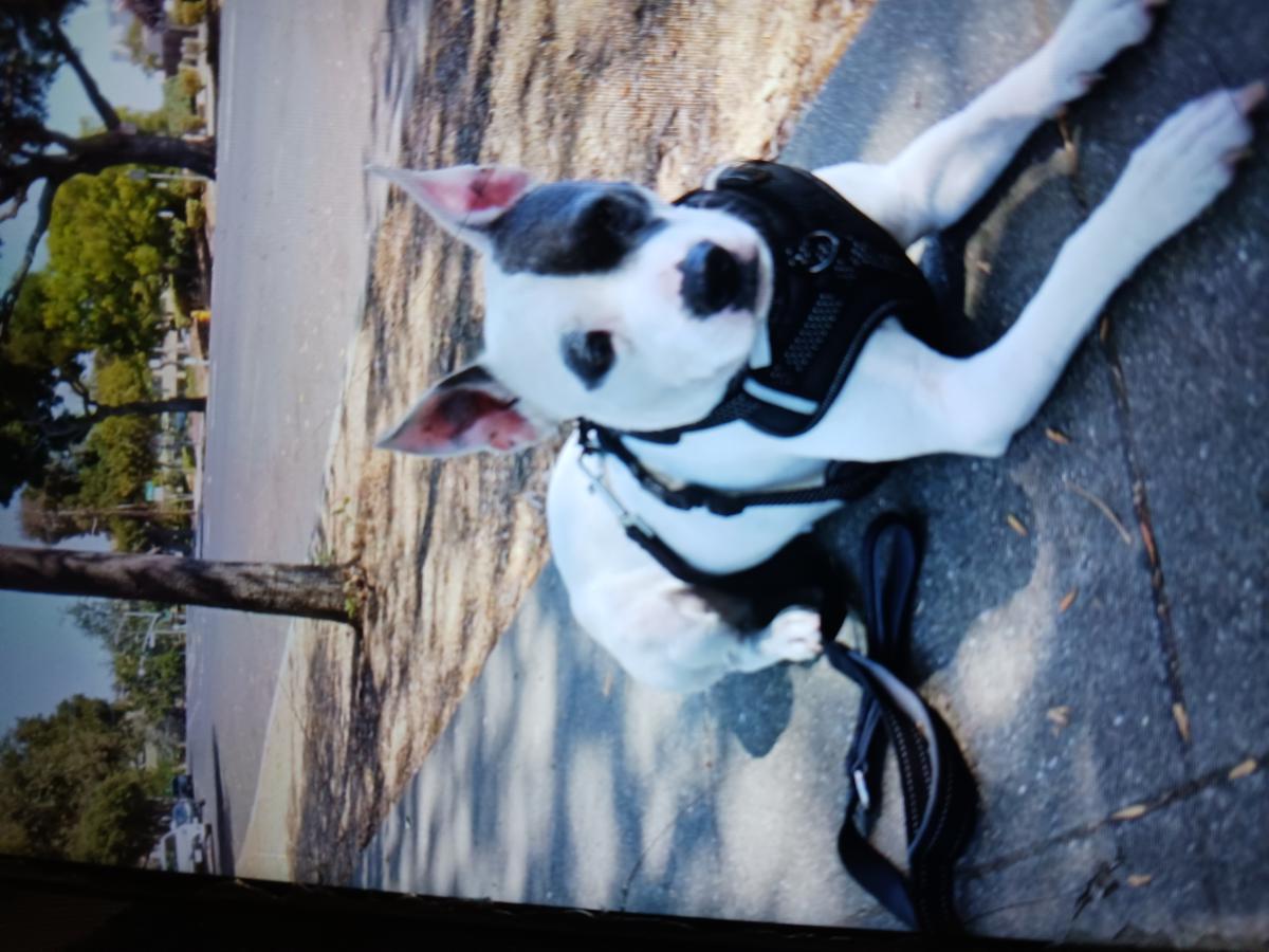 Pet Description:Small all white Pit terrier with dk. Grey patch over eye. |