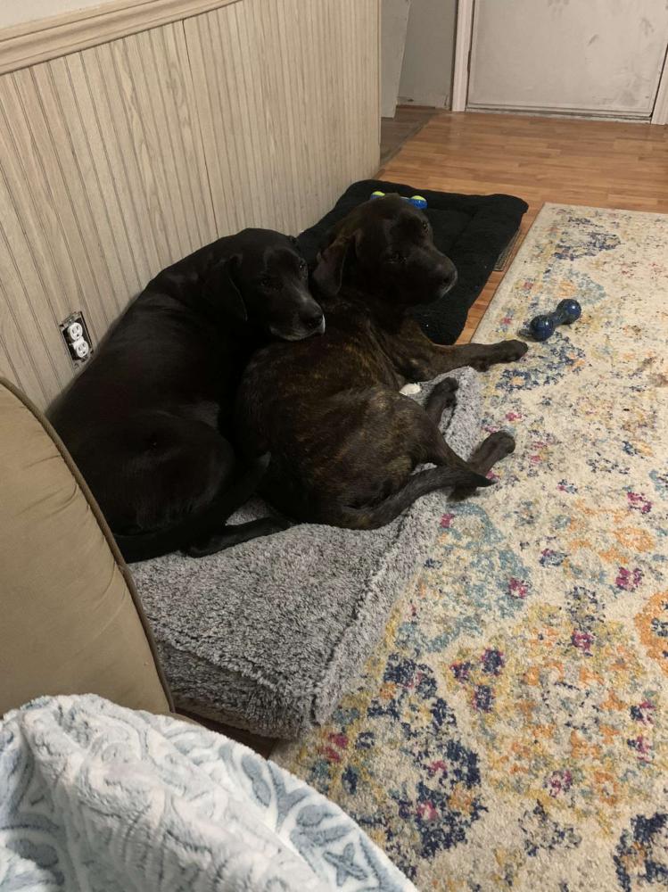 Pet Description:Two dogs - one is a lab and pit mix with a hurt right hip with a little white and the other is a pit brown and black |
