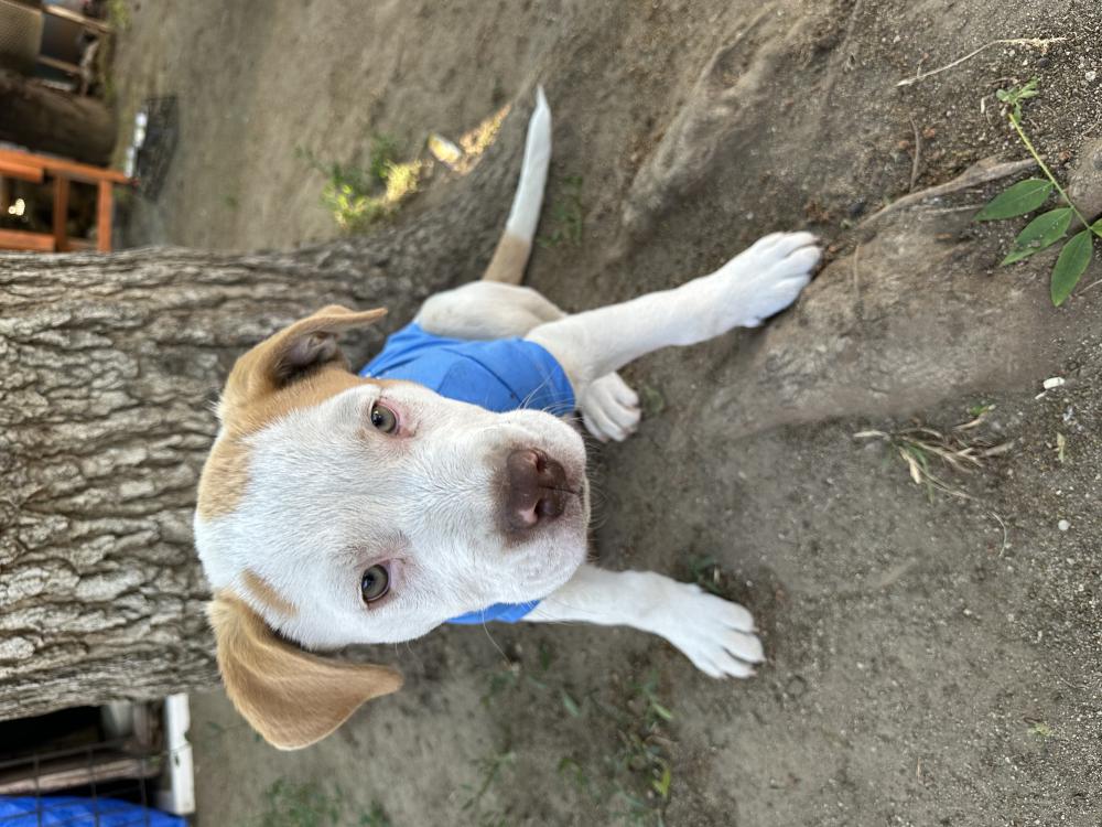 Pet Description:White male Mixed pit bull, brown nose and brown spots |