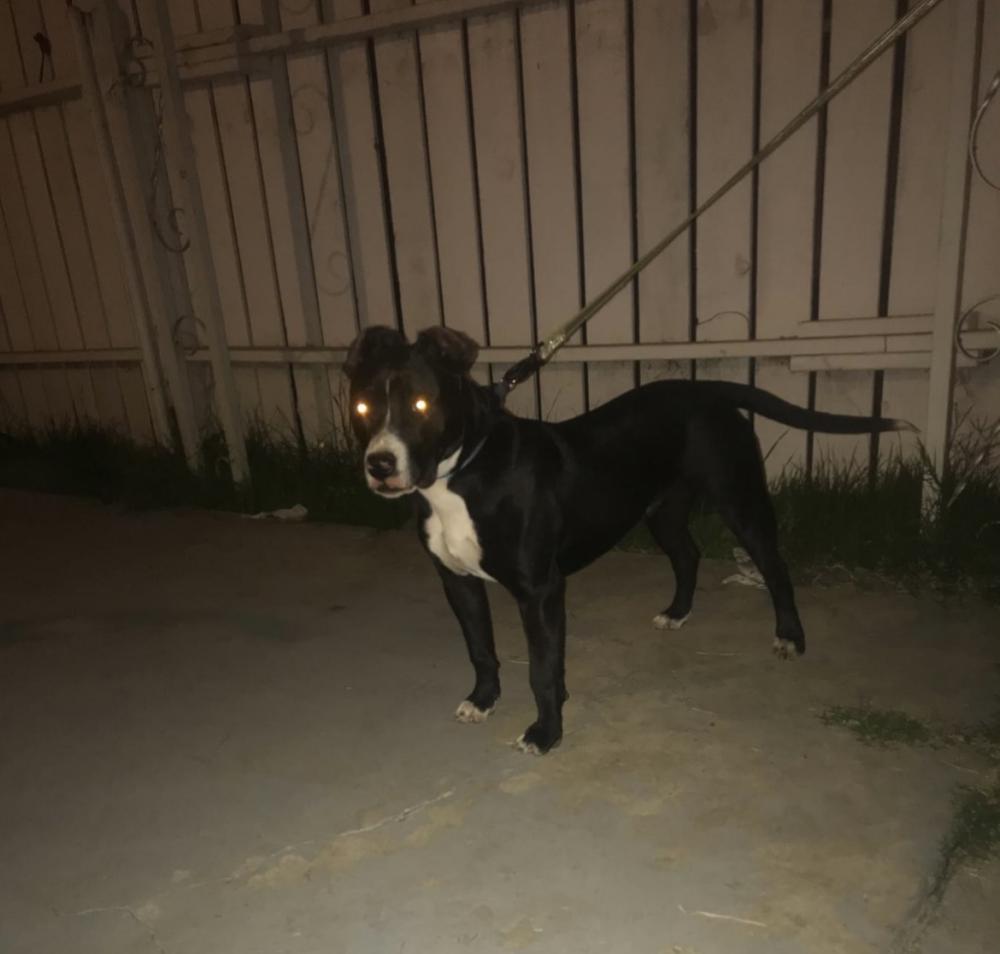Pet Description:Black and white dog, pitbull mix with boxer |