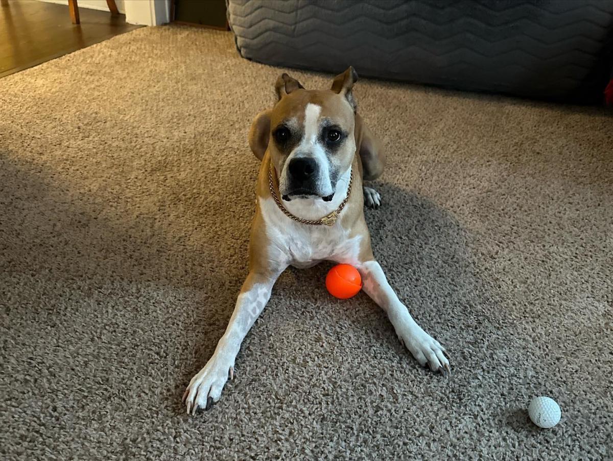 Pet Description:About 40 lbs, black scar on her back side, white belly with black spots and white legs |