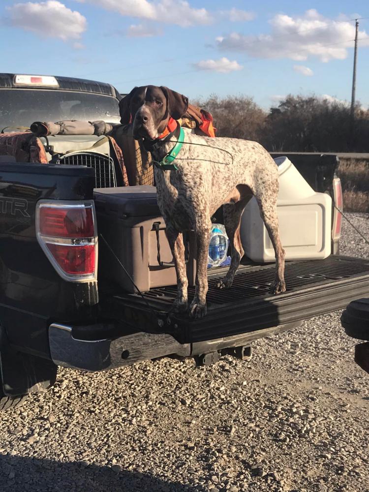 Pet Description:White n Brown German Short Haired pointer, wearing a hunter orange collar |