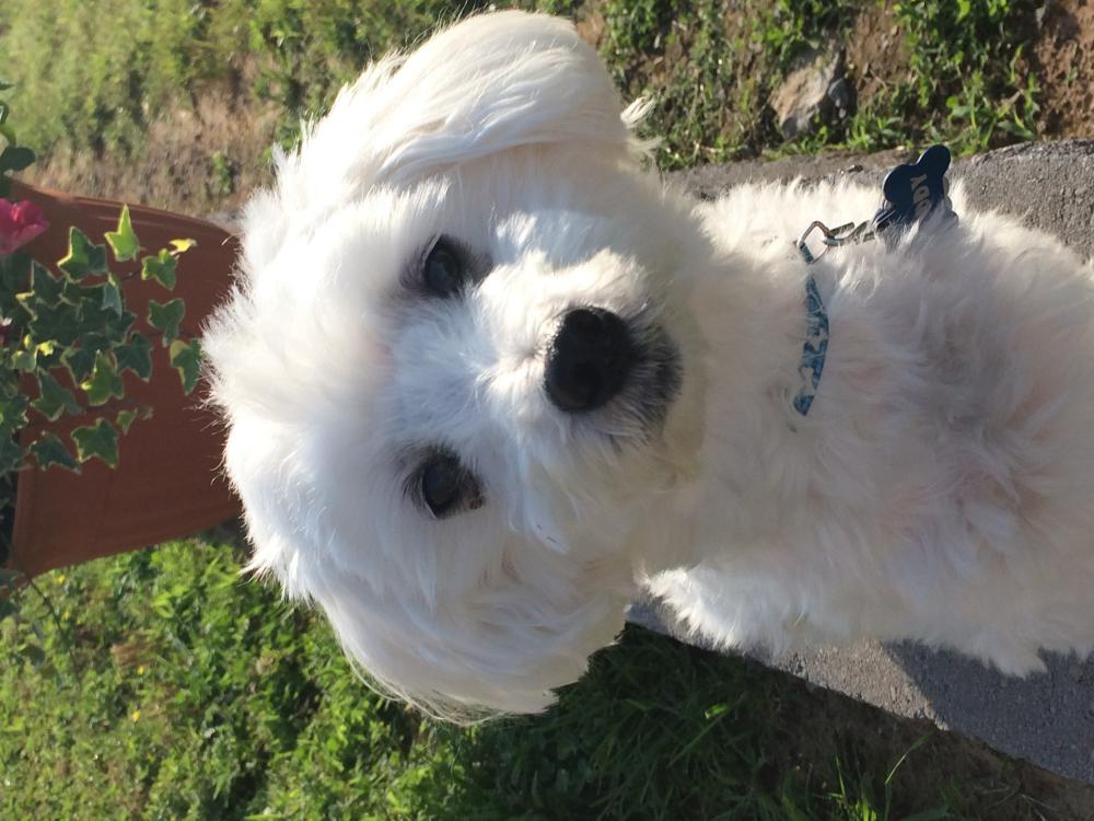 Pet Description:White, male Maltese, 9 yrs old, brown pigment on belly |