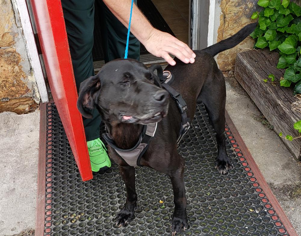 Pet Description:Black lab or possibly hound mix, very friendly. Wearing gray/black harness with handle. |