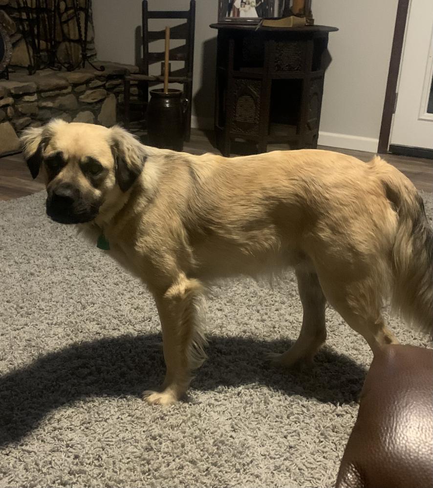 Pet Description:Brown/tan mix, weighs 55 lbs, has on a collar (bama) with vet tag, very friendly but might be very scared. |