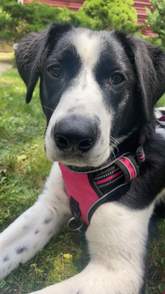 Pet Description:Annie is a seven month old puppy with a pink harness and a pink and black leash attached. Her name tag is in the shape of a bone and it has her name Annie and our home phone number (973-770-2529). She’s black and white and resembles the markings of a border collie. |