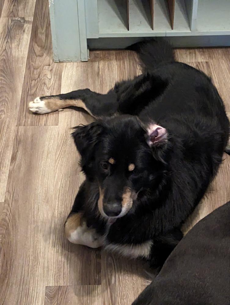 Pet Description:Black, tan and white Great Pyrenees with brown eyes, he's a year and a half old and very friendly. |