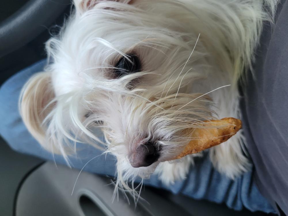 Pet Description:White small dog, brown spot on back, black eyes. Very anxious. |