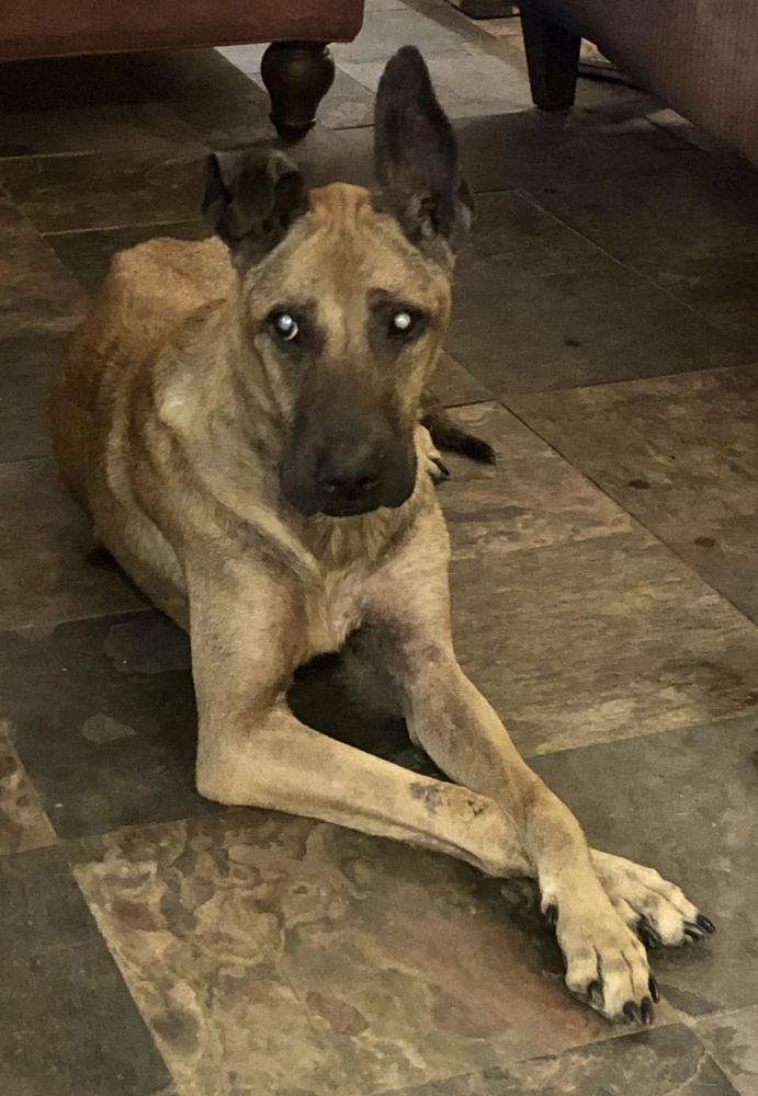 Pet Description:Dog is mixed Belgian Malinois and Blue Tick Coonhound. She has one ear that stands up and one that does not. She is blind due to diabetes. She has very short fur and is skinny due to declining health from diabetes. She will want to eat a lot and drink a ton of water. |
