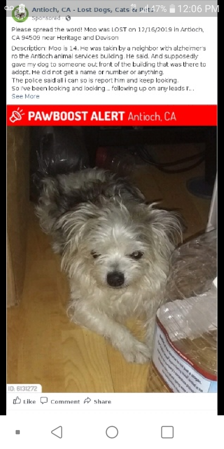 Pet Description:White with black and grey markings like a cow. Weighs about 7 pds. Doesn't like to be alone, cries and howls.He's 14 and I've had him since he was a pup. I miss him soooooo much.He was taken from in front of the house by an elderly neighbor with alzheimer's who says he took him to antioch animal services and handed him to some lady in front of the building that wanted him.If you have seen him please help bring him home.Text 925-395-0964Thank youMy name is Shelly |
