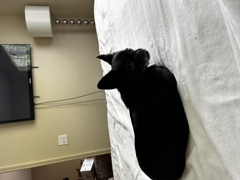 Pet Description:Small black dog with white paws and white chest. Has on a pink collar with a tiny bell |