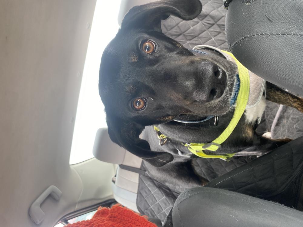 Pet Description:black female lab mix with white chest, brindled paws. knows how to sit, give paw, is potty trained. |