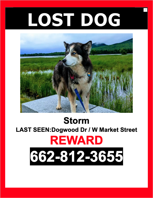 Pet Description:*MISSING SINCE 7/27/2023 AT 8:00 PM**Storm is a Female, Black and Tan / Blue eyed, Husky who escaped and was last seen near Dogwood Dr & W Market Street.Storm is not wearing her collar without tags and is microchipped.If you see Storm please DO NOT CHASE HER.PLEASE CALL OR TEXT ONLY.662-812-3655$$ Reward $$ |