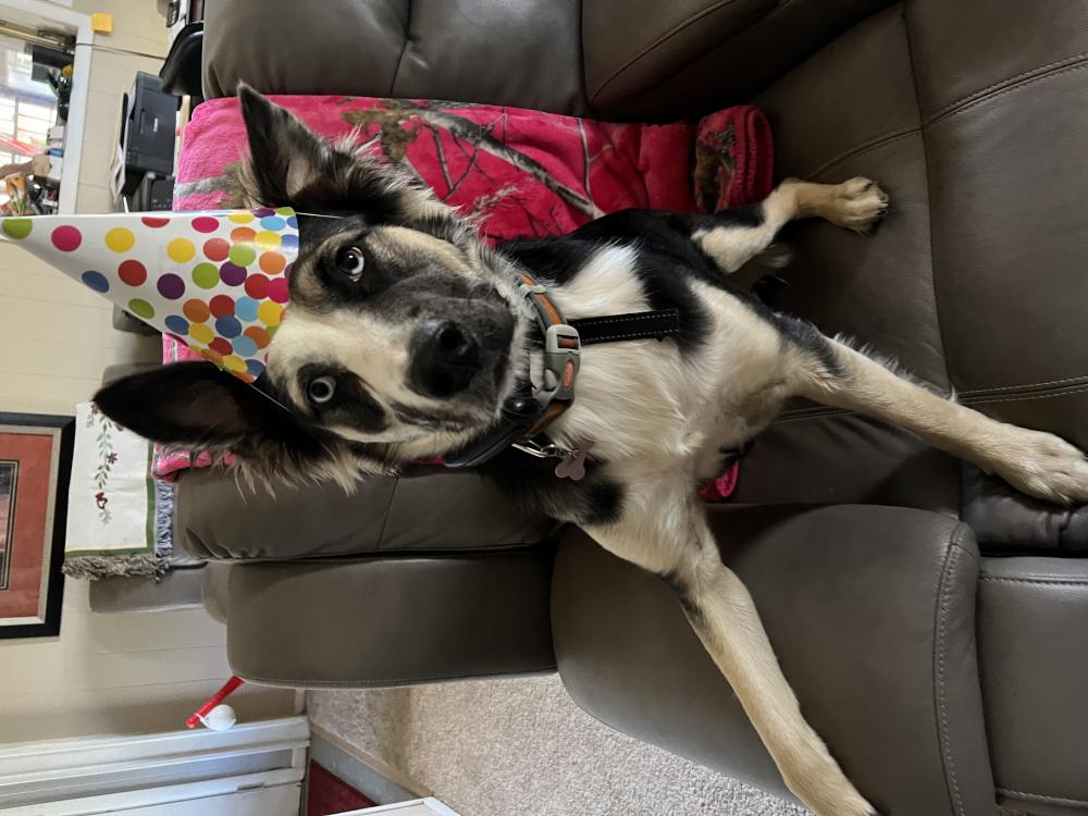Pet Description:black and white Austrian shepard with one blue eye and one half blue half brown eye, both ears stand up |