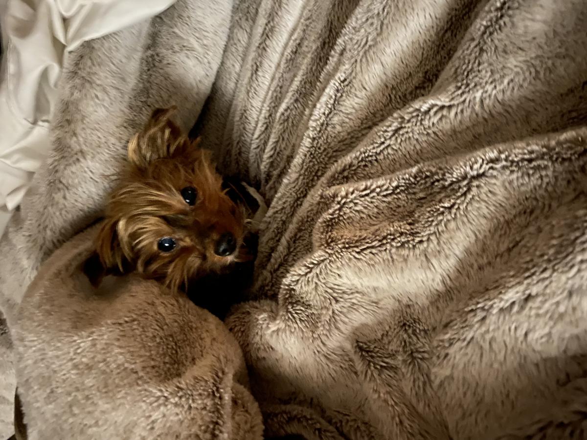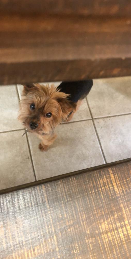 Pet Description:Small 6 pound male Yorkshire terrier with mostly black body and brown head. Has brown hair on underneath. Bow tie collar on with name tag on. Short hair cut. |