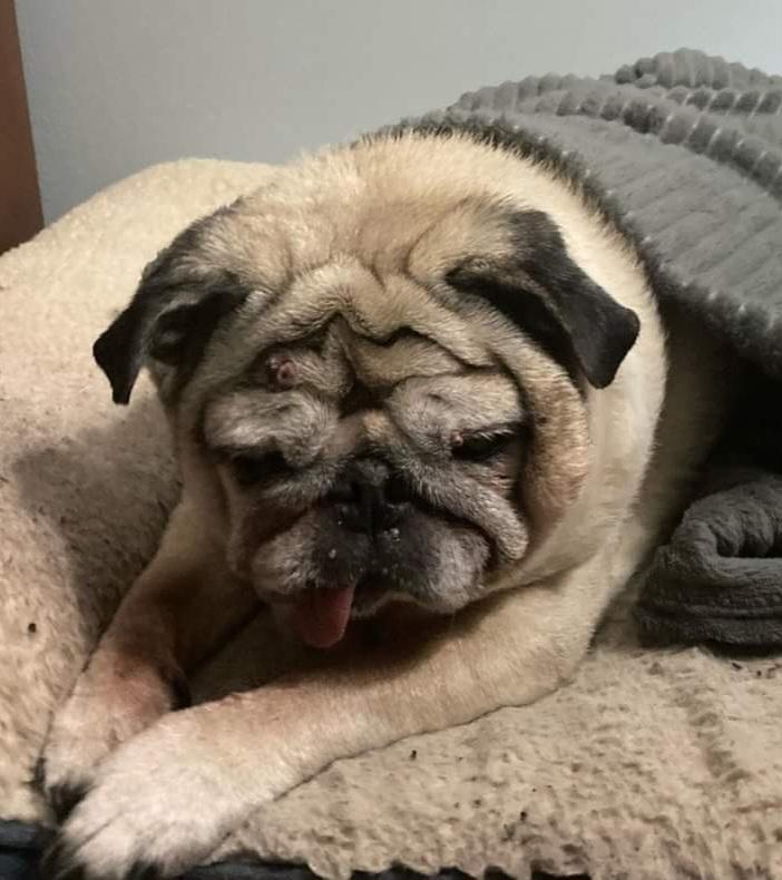 Pet Description:Moon Beam is a 14 year old Fawn colored pug. She has a slight limp and a large wart above her right eye. She is about 22 pounds and does not really go too far. |