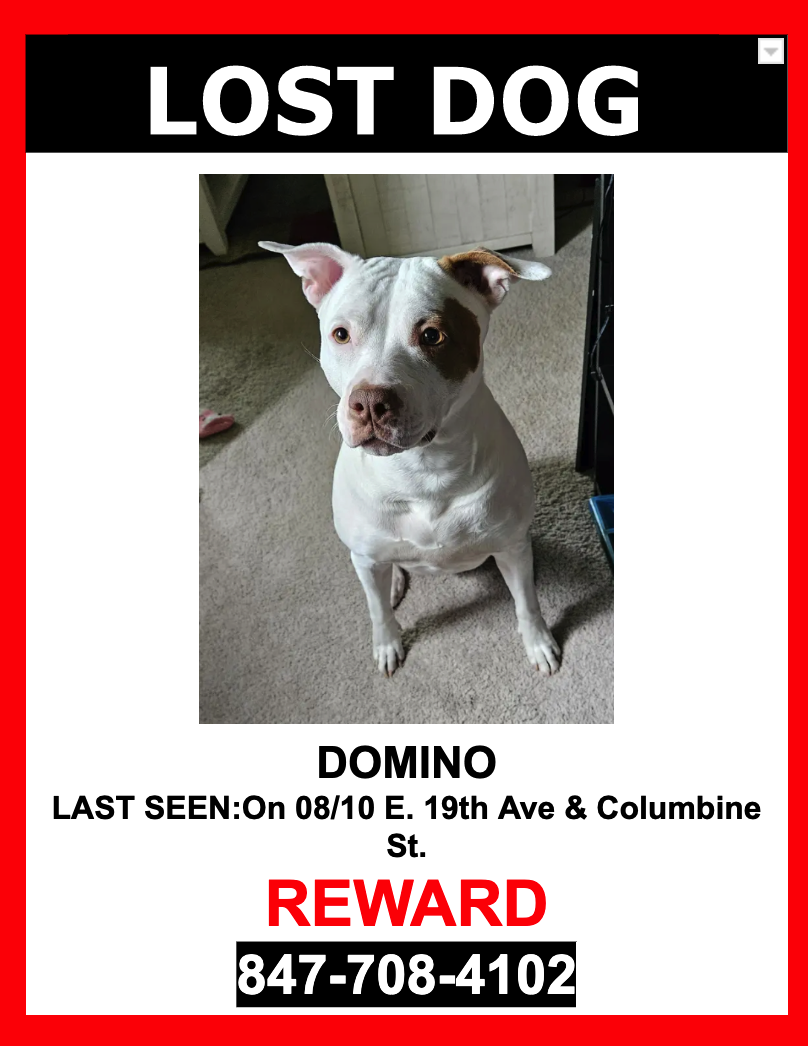 Pet Description:**MISSING SINCE 08/10/2023 AT 12:30 PM**Domino is a female, white with brown markings, American Staffordshire Terrier who escaped and was last seen near E. 19th Ave. and Columbine St..Domino is wearing HER COLLAR with TAGS and IS microchipped.If you see DOMINO please DO NOT CHASE HER.PLEASE CALL OR TEXT ONLY.1-847-708-4102$$ Reward $$ |