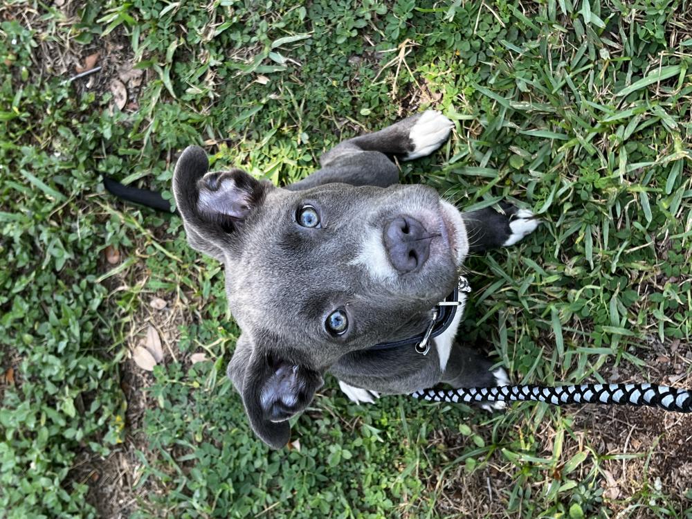 Pet Description:Small dark grey pitbull puppy with a white belly and a black leather collar with diamonds on it. |