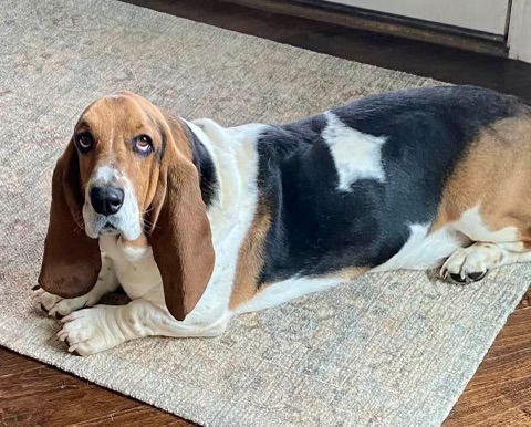 Pet Description:Male basset hound tri color with a white star shape mid back |