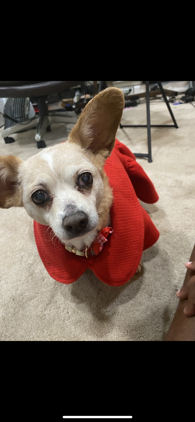Pet Description:tan colored Elderly dog, partially deaf and blind. She has allergies so her skin is patchy. She has a colla |