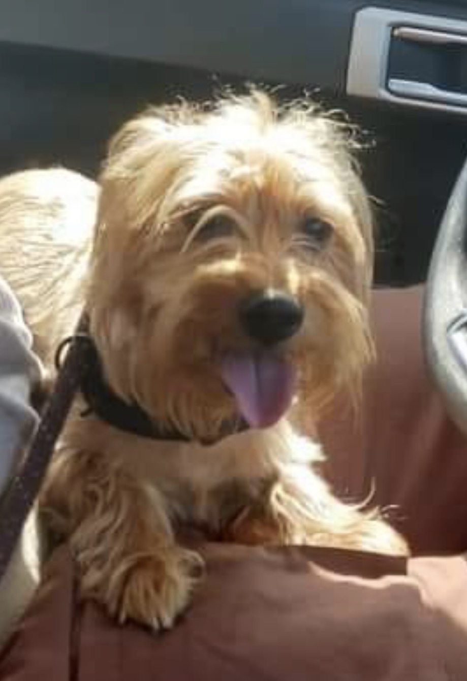 Pet Description:Small tan Yorkie chihuahua green military collar. Do not approach her will run away |