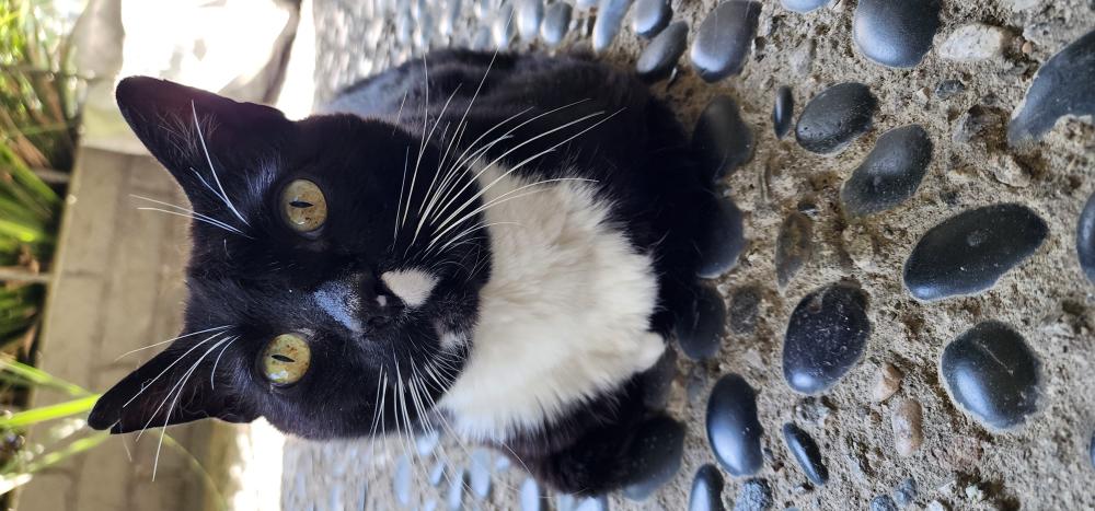 Pet Description:Brave is black and white, but if you get close and spread his fur, you'll see he appears brown.He has a white mark on his right, upper lip, a white chest, and four white paws. One of said paws is missing a toe. There are two clips on his right ear and he has green eyes. |