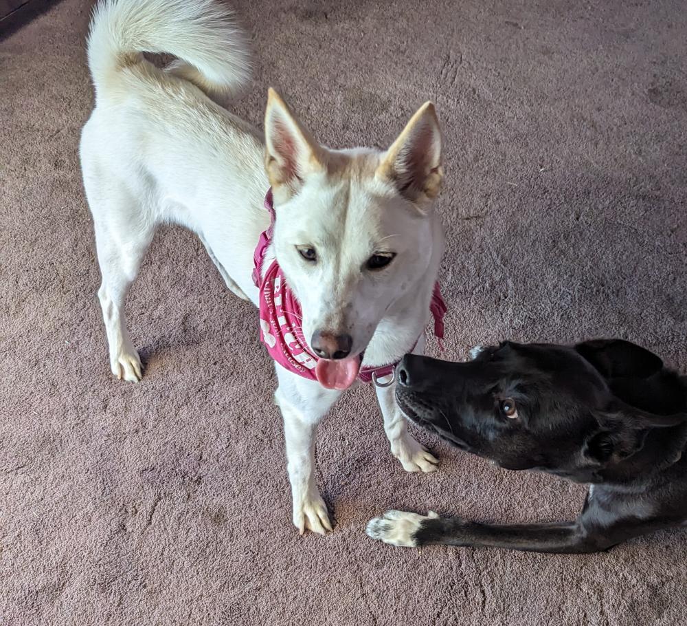 Pet Description:Medium size dog white. Pink harness. Located in bear de |