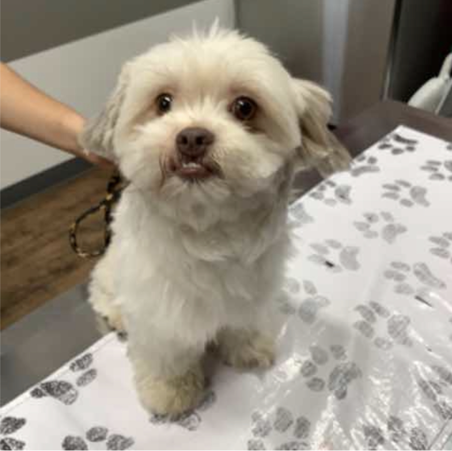 Pet Description:Shih Tzu/Maltese he is an off white color with an underbite that makes him show his teeth. He has a tan/red hair spot on the his back |