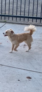 Pet Description:Wearing a red collar is white and yellow color small friendly |