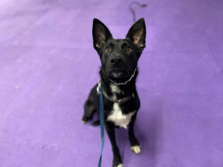 Pet Description:He is a black border Collie, with a large white spot on his chest. Has 2 white front paws. He is a recent rescue dog so is very timid. |