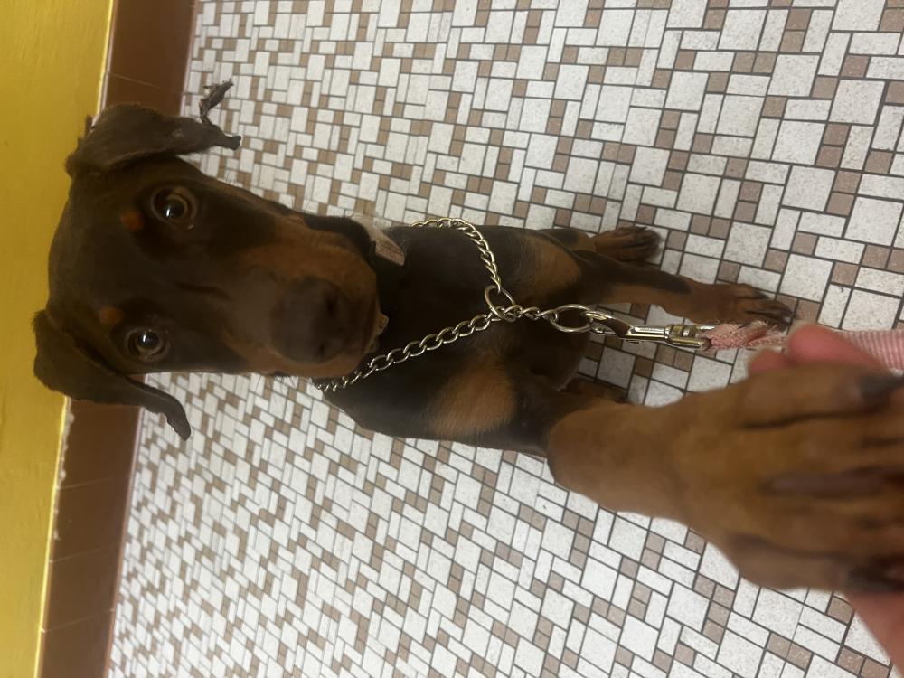 Pet Description:She is a Doberman puppy about 18 weeks old red rust color. She is wearing a pink collar, her ears have been cropped but not posted since her ears are healing and is currently on ointment and antibiotics from the vet. She’s |
