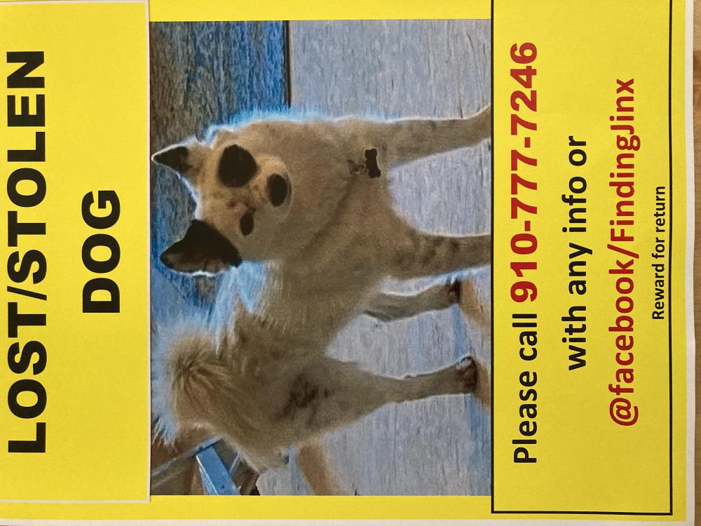 Pet Description:White with black left eye and black right ear also has black spots on his body |