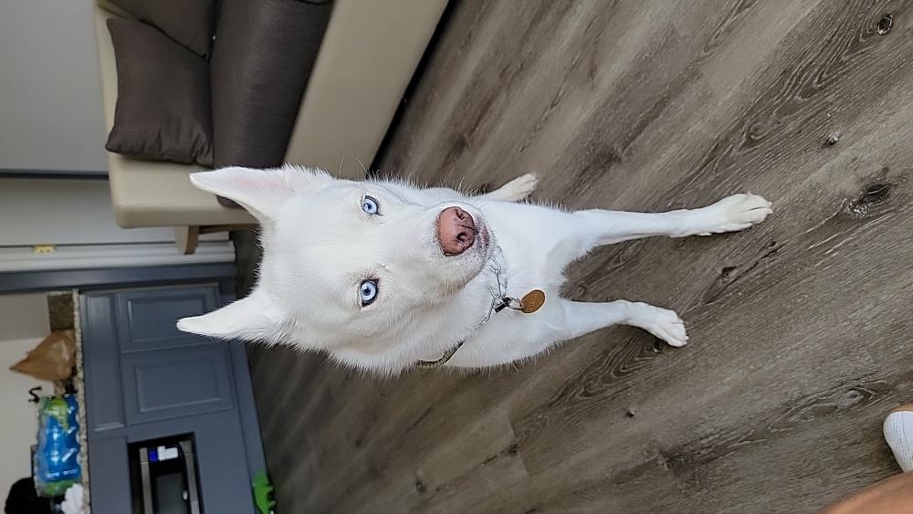 Pet Description:She is a fully white Siberian husky. She has a green collar. Approach er slowly. She doesn't bite. She may respond to squeaky toys. |